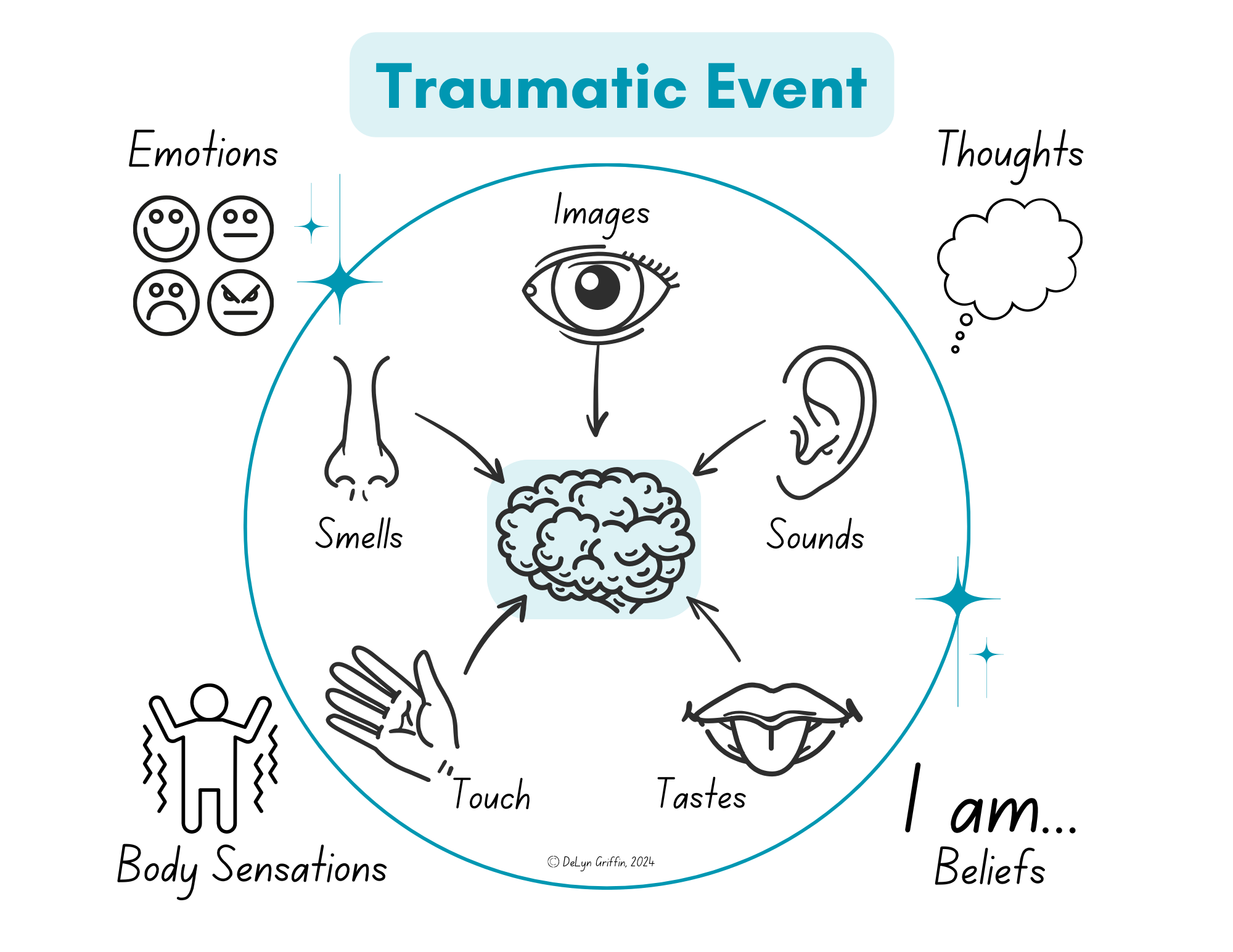 Simple outline to help explain the AIP model and the different parts of a memory that can get stuck in a traumatic event.
